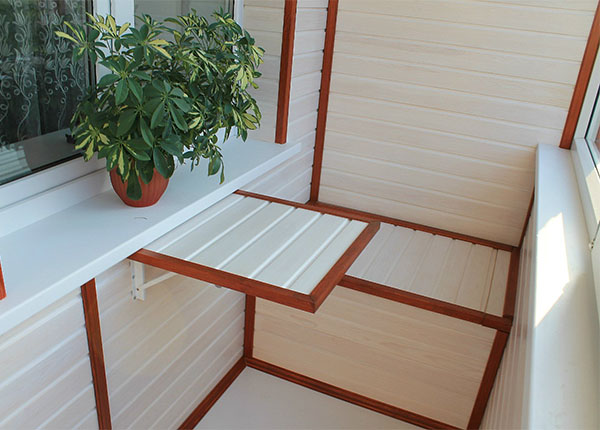 Перед отделкой мы выполнили обработку стен специальным средством, препятствующим образованию грибка и плесени. Затем нанесли пенополиэтелен — тонкий утеплитель, после чего выполнили отделку балкона деревянной вагонкой по технологии. Интерьер помещения вышел со вкусом и пришелся по душе заказчику.